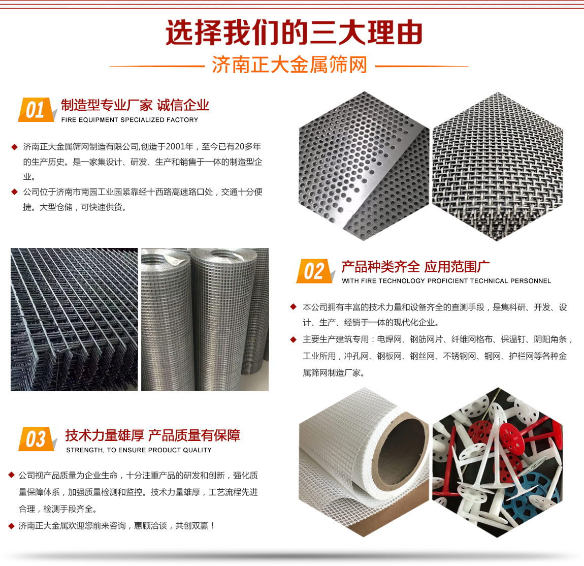 濟(jì)南正大金屬篩網(wǎng)制造有限公司,成立于2001年,至今已有20多年的生產(chǎn)歷史,主要生產(chǎn)建筑用:電焊網(wǎng)、鋼筋網(wǎng)片、纖維網(wǎng)格布、保溫釘、陰陽(yáng)角條,工業(yè)所用,沖孔網(wǎng)、鋼板網(wǎng)、鋼絲網(wǎng)、不銹鋼網(wǎng)、銅網(wǎng)、護(hù)欄網(wǎng)等各種金屬篩網(wǎng)制造廠家。 本公司擁有豐富的技術(shù)力量和設(shè)備齊全的查測(cè)手段,是集科研、開(kāi)發(fā)、設(shè)計(jì)、生產(chǎn)、經(jīng)銷于一體的現(xiàn)代化企業(yè)。公司位于濟(jì)南市南園工業(yè)園緊靠經(jīng)十西路高速路口處,交通十分便捷。